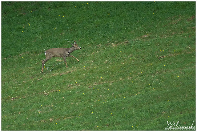 Wie ihr selbst erkennen könnt, befindet sich am Geweih von einem Bock ein längeres Stück von einem Weidenzaun. Dieses "Problem", habe ich einer Organisation gemeldet. Bzw. eine Anfrage gestellt ob man dem Bock in irgendeiner Form helfen könne, da die Verletzungsgefahr (Strangulieren, Fleischwunden durch die Reibung) sehr hoch sein könnten und ihm bei einer Flucht auf der Straße auch evtl. behindern könnte (Stolpergefahr), auch wenn es ihm so bei seinem normalen Treiben (Fressen und normales Laufen), wie meine Fotos auch belegen können, nicht stört.
