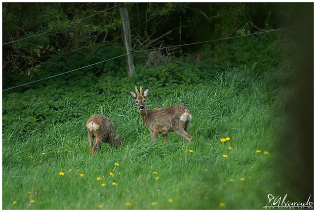 Jedenfalls ... als ich die Rehe sah, bückte ich mich hinter den Büschen und wechselte leise mein Objektiv auf das Samyang 500mm. Ich versuchte durch die Büsche zu fokussieren und blieb einfach dort wo ich war, denn die Stelle war ideal. Im nachhinein sehe ich selbst, dass man schon auf den ersten Fotos den Zaun am Geweih hätte sehen können, aber ich hatte es nicht bemerkt, da ich nur die Belichtung nach dem ersten Foto überprüft hatte und mir sonst die Fotos nicht weiter angeschaut hatte.