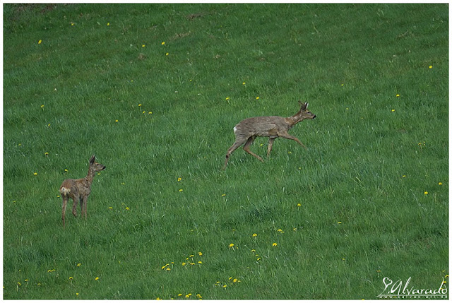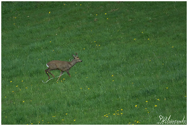 Auf meinen Fotos ist es nicht erkennbar und ich habe aus Unwissenheit nicht darauf geachtet wie seine Sprünge aussahen als sie beim ersten mal weggelaufen waren. Aber dieses Weglaufen, was ich beobachten konnte war keine direkte Flucht, wenn sie richtig flüchten sind Rehe viel schneller!