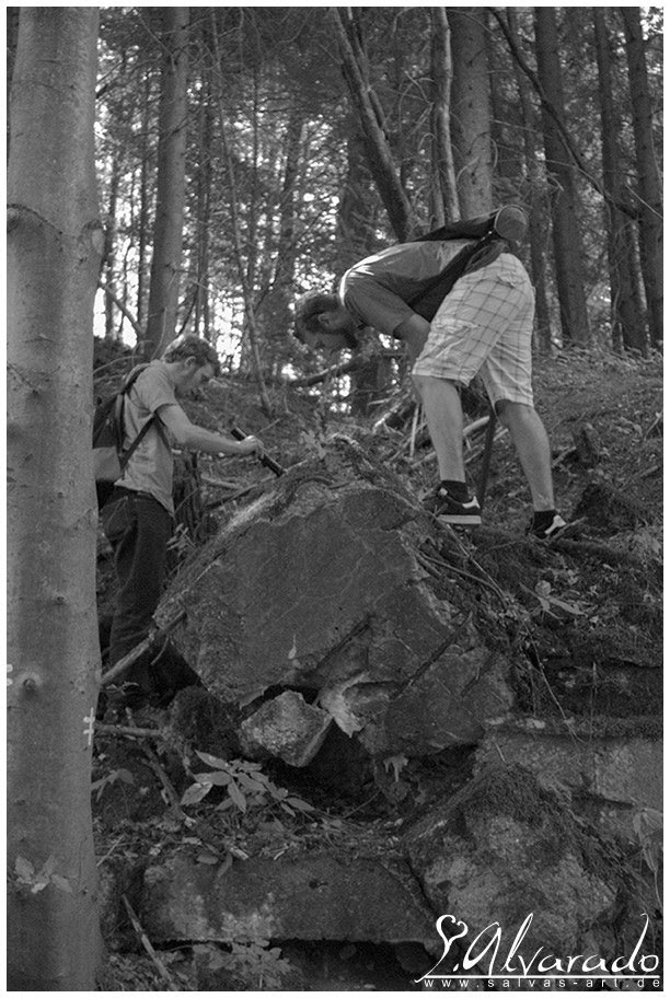 Den letzten Fundort habe ich zufällig entdeckt. Die anderen waren wie man oben auf den Foto sehen kann, über die Ruine geklettert oder haben sie umlaufen ... Wege die ich persönlich nicht gehen wollte, weswegen ich einen anderen Weg suchte ... Dies war auch mit die einzige Situation wo sich unsere Gruppe aufteilte und wir uns kurze Zeit nicht sahen und ich auch dankbar war, dass ich jedenfalls auffällig gekleidet war ... Ich musste den Platz weitläufig umgehen und sah im Wald nichts und niemanden mehr ... Mittels zurufen und pfeifen fanden wir dann doch wieder zusammen. Und wir liefen zu dem Platz den ich entdeckt hatte ...