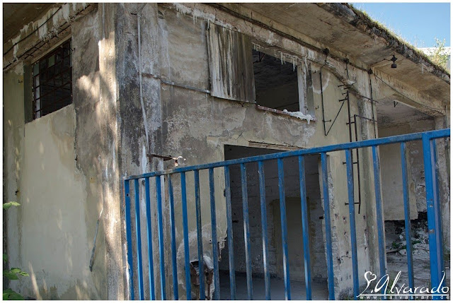 Alle Fenster und Türen waren mit Gittern versehen, einzig diese eine "Tür" war geöffnet ... doch so einfach kam man nicht dort hinein ... Ca. 1,20m hoch war das Fundament und in einer entsprechenden Höhe auch die Tür ... Da ich unter 1,70cm groß bin, ist das für schon eine ungewohnte Höhe ... Ein stabiles Holzstück, das dort bereits war sollte den Einstieg in das Gebäude erleichtern .... Da ich keinerlei Erfahrungen darin habe, an Wänden hochzuklettern und noch dazu extreme Höhenangst habe (ich schaffe es auf einer Leiter gerade mal auf die dritte Sprosse und steige ungerne auf Stühlen/Tischen usw.) ... nahm ich dankend die Hilfestellung meiner männlichen Begleiter an, die aus einer Räuberleiter, Schub- und Hub-Bewegungen bestand... Ja, vielleicht für andere ein wenig zu viel Tamtam, aber sonst wäre ich nicht dort hoch gekommen ...