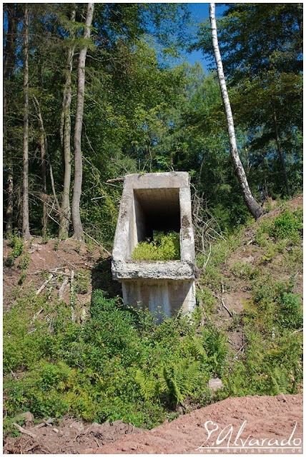Hier entdeckten wir mehrere (so um die 6 Stück) Schornsteinschächte? Wir wissen es selbst nicht so genau ... Einige dieser Bauwerke waren noch sehr gut erhalten und dementsprechend tief wie das auf den beiden Fotos unten. Andere dagegen gerade mal kniehoch. Bei unaufmerksamen Laufen hätte hier und da die Gefahr bestanden in einen solchen Schacht reinzufallen ... In einigen dieser Schächte waren Äste und Laub die auch einen Boden vortäuschten ... In einigen Befanden sich kleine Tannen und in einem weiteren Schacht sahen wir einen Besen ...