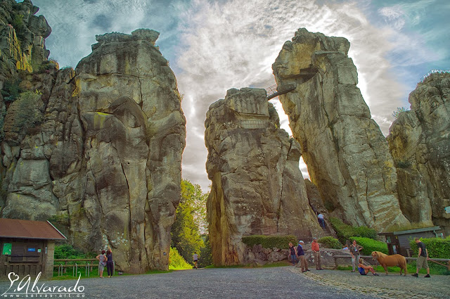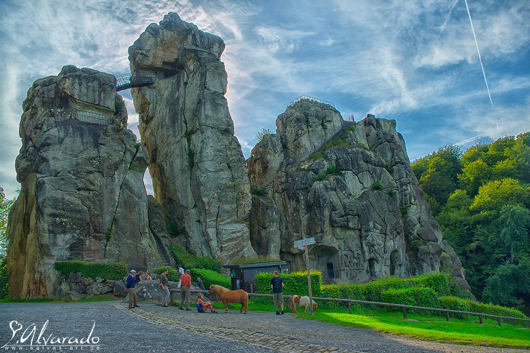Wanderer erreichen die Externsteine von Norden her kommend über den Hermannsweg und von Süden her kommend über den Eggeweg, der Teil des Europäischen Fernwanderwegs E1 ist.