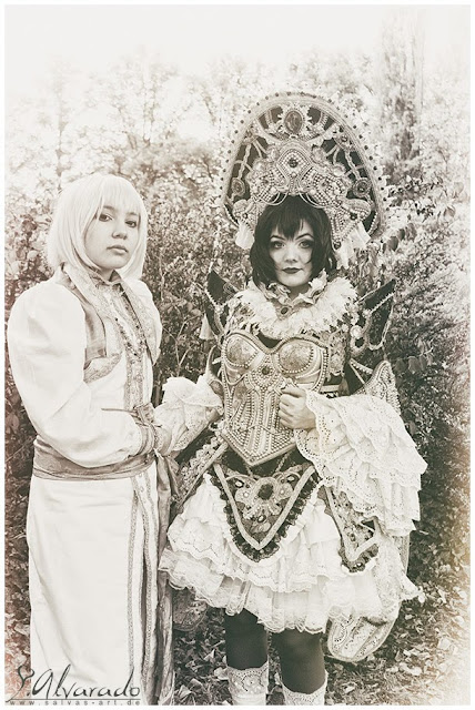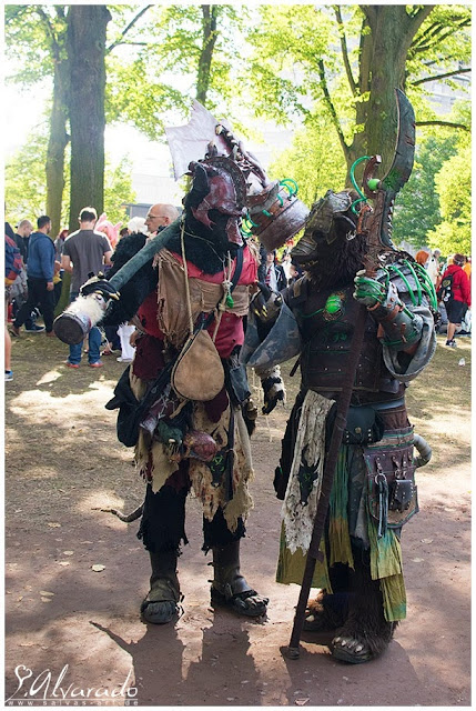 Sie saßen gerade auf der Mauer und ruhten sich wahrscheinlich aus, als ich sie für ein Foto bat doch noch mal aufzustehen ... Das sowas anstrengend und ermüdend sein kann, kann man sich bei schweren Kostümen gut vorstellen... Und vor allem ist ein hinsetzen und aufstehen auch oft das Todesurteil für Kostüme ... Bloß nicht irgendwo hängenbleiben... keine Flecken riskieren ... Ein enormer Aufwand der jedes Mal berücksichtig werden muss, weswegen sich nicht jeder Cosplayer einfach so fotografieren lässt ...