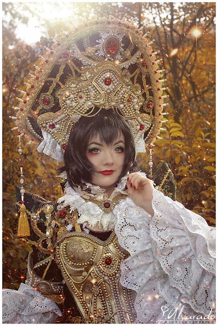 Ach... da fällt mir ein.... In der Stadthalle in einem Raum wo so viele kleine Stände aufgebaut waren, fiel mir ein Stand auf mit einer Cosplayerin auf, die ein unglaubliches Kostüm trug ... Sie hatte ihren eigenen Stand an den man Fotobücher von ihr erwerben konnte. Es standen einige an um sich mit ihr fotografieren zu lassen ... und da ich von ihrem Kostüm so begeistert war stand ich auch an und wartete brav bis ich sie um ein Foto bitten konnte ...