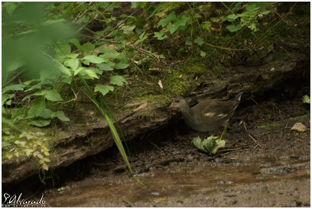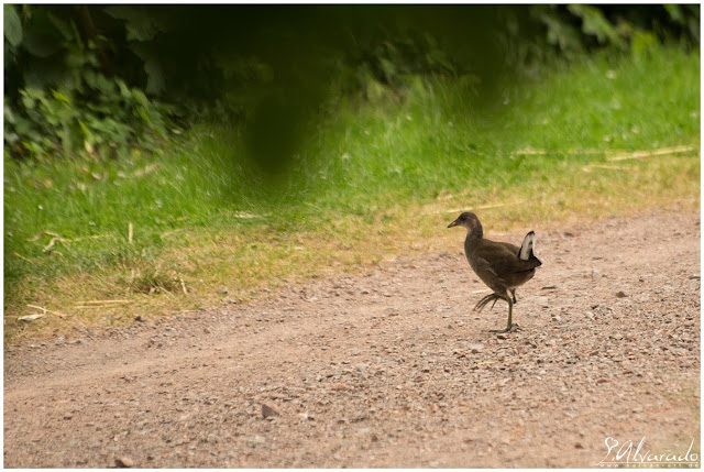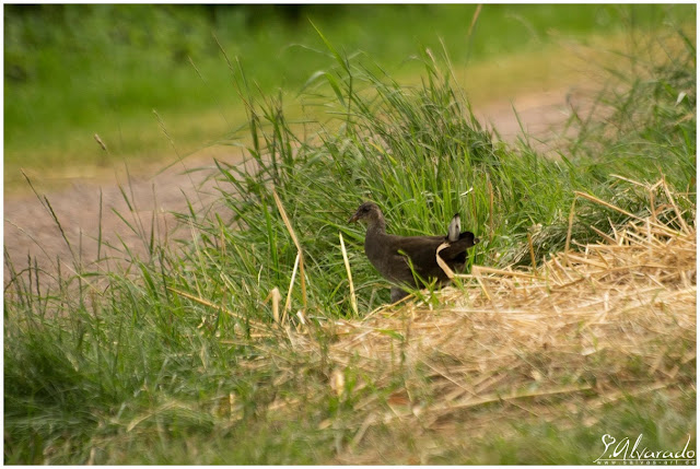 Die älteren Teichrallen, die dort in dem Gebiet scheinbar zur Welt gekommen waren, erkundeten das Gebiet auch intensiver als die Paarungsfreudige Elterntiere. So konnte ich sie ab und mal am Feldrand erwischen ... aber wie man sehen kann, erforderte es sehr viel Vorsicht.