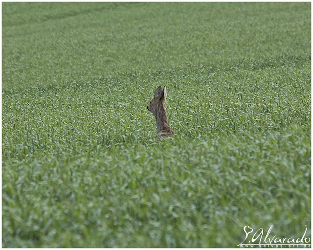 Wir machten an einer Stelle halt wo wir noch so hoch genug standen, um über das Getreidefeld schauen und an das andere Ende schauen zu konnten... Hier wollten wir uns vergewissern, dass das Reh nicht in den nah liegenden Wald verschwindet ... Wir beobachten es eine Weile.