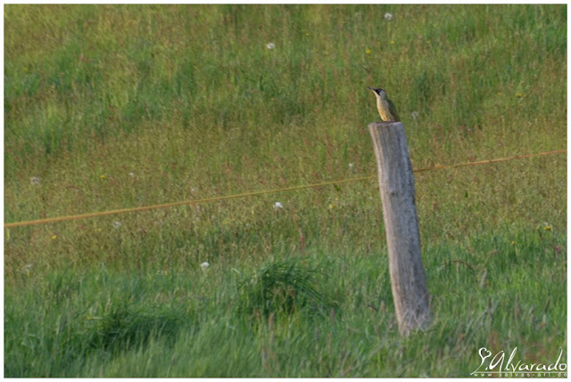 Zu unserem Erstaunen konnten wir aber auch einen Grünspecht (Picus viridis) sichten. Dieser hatte sich an einen Pfosten festgekrallt und schaute sich nahezu lautlos um. Nur einmal gab er einen Laut von sich, weswegen wir ihn in der Ferne und im ganzen Grün drum herum überhaupt wahrnehmen konnten ... später verschwand er in den Bäumen hinter ihm.
